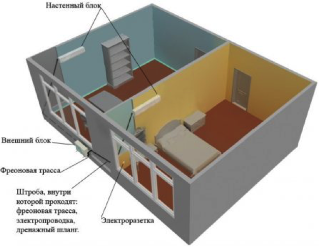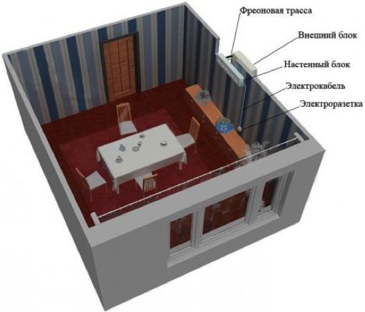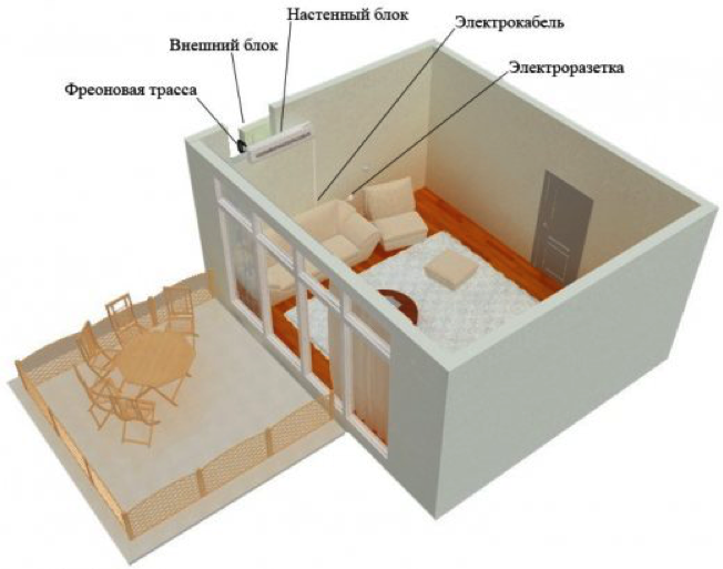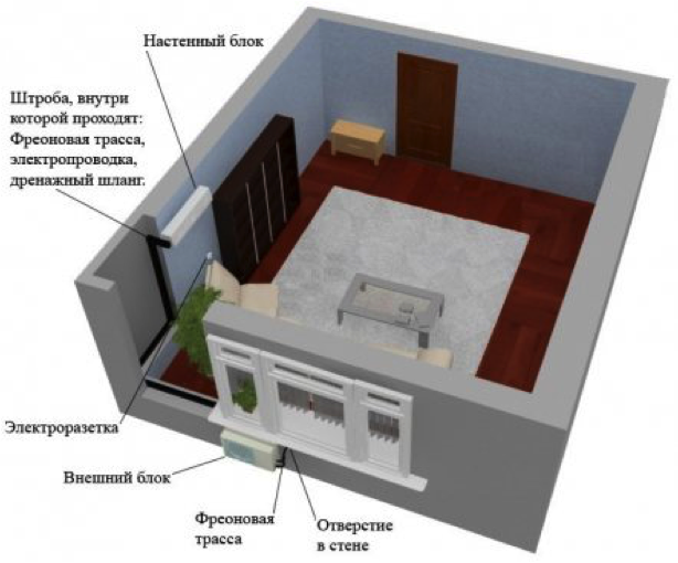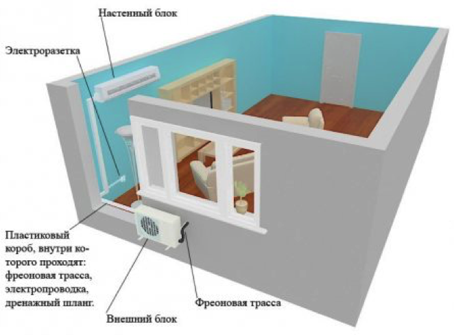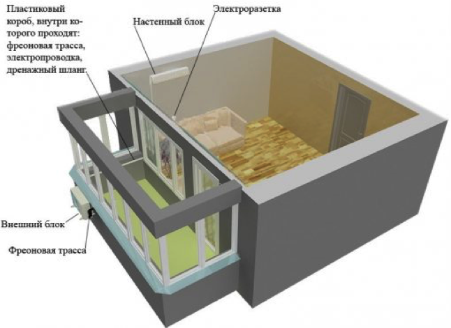 Как понятно с названия, такой вариант применяют для комнат, в которых есть балкон или лоджия. Главное отличие состоит в том, что увеличивается длина коммуникации между внешним и внутренним блоками кондиционера, поскольку трасса дополнительно проходит по стене лоджии(балкона). При этом также появляется необходимость в дополнительном отверстии на балконе для вывода коммуникаций наружу. Кроме того, следует учесть и траекторию прохождения трассы, ведь для вывода дренажной трубки на улицу нужно тщательно соблюдать постоянный и равномерный уклон. Если необходимый уклон обеспечить не удается, то просверливают дополнительное отверстие и выводят шланг наружу «досрочно».